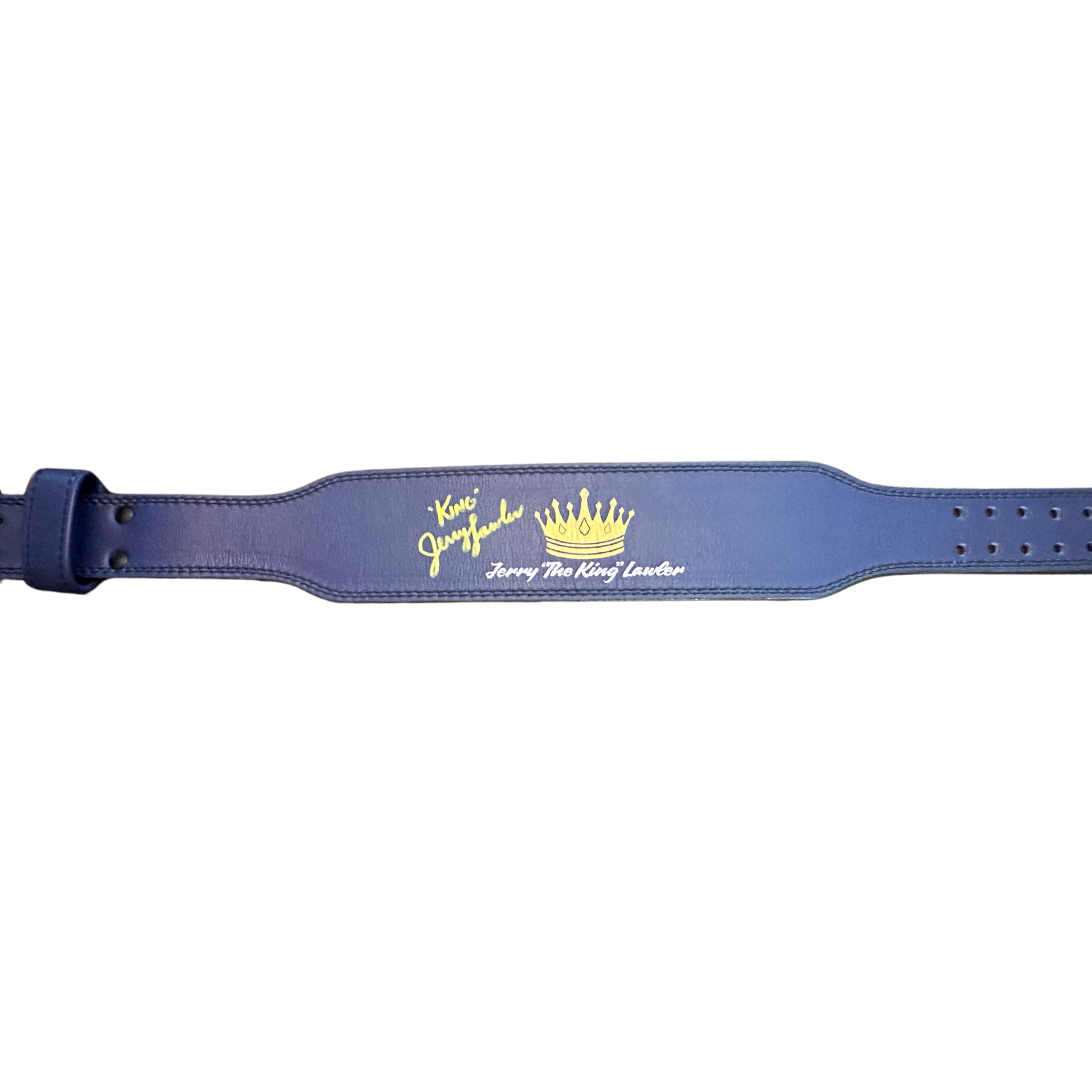 This unique blue weight belt boasts a bold statement, just like The King himself. Lawler's signature, rendered in a contrasting yellow, adds a personalized touch to this already eye-catching collectible.