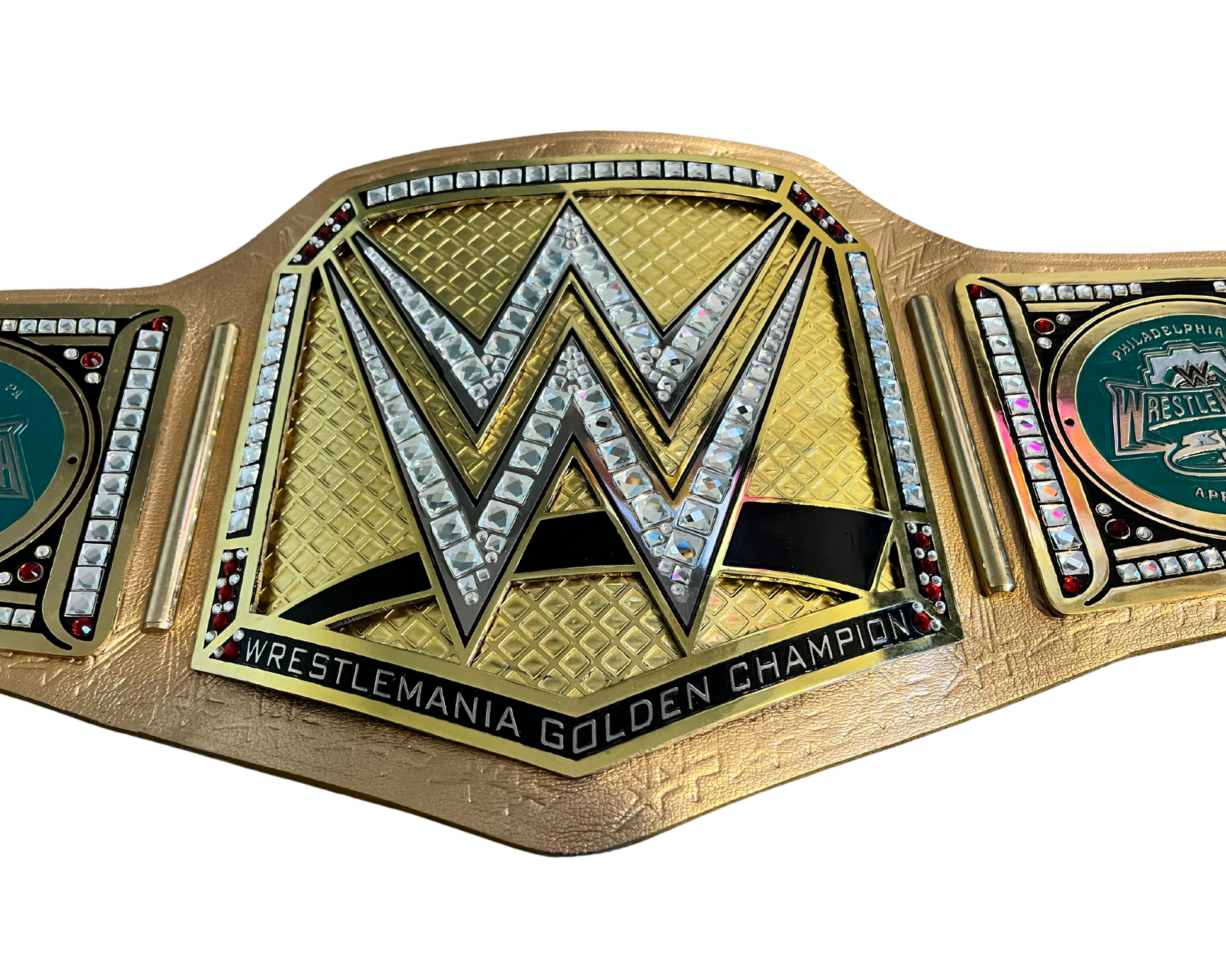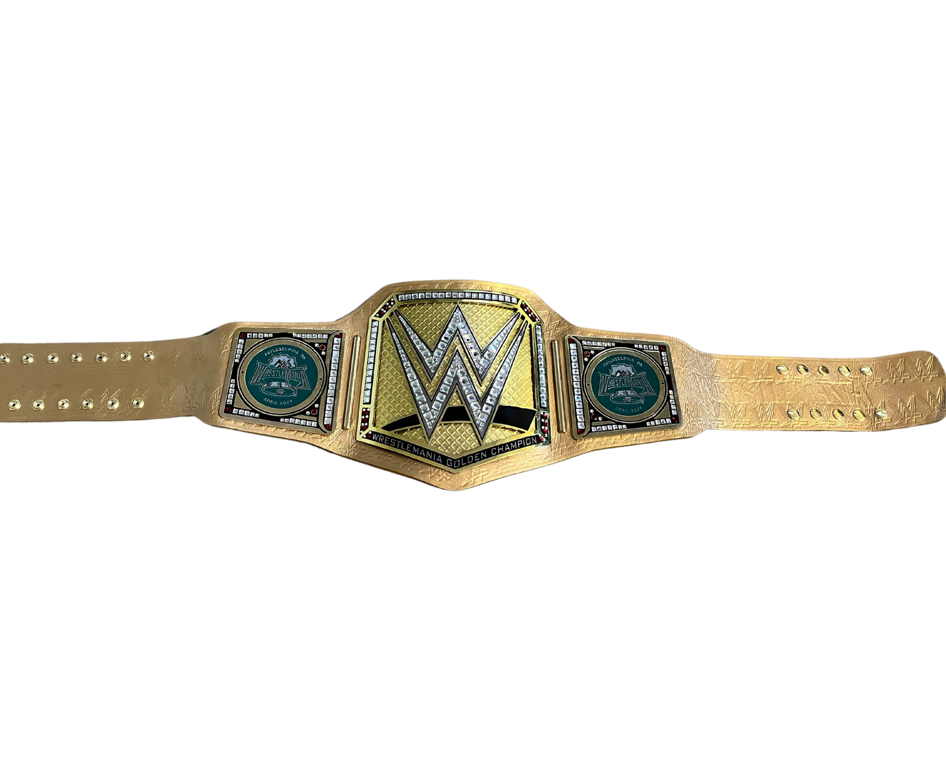 A Celebration of Greatness: Forget the traditional designs of specific titles. This belt is a celebration of WrestleMania itself, the Grandest Stage of Them All. Its heart is a gleaming gold plate, etched with the iconic WrestleMania logo – a symbol of the night where legends are crowned and dreams are realized. The side plates, adorned with swirling patterns, hint at the unpredictable nature of WrestleMania's main events. The supple gold leather strap adds a touch of elegance, a nod to the prestigious nature of the victory it represents.