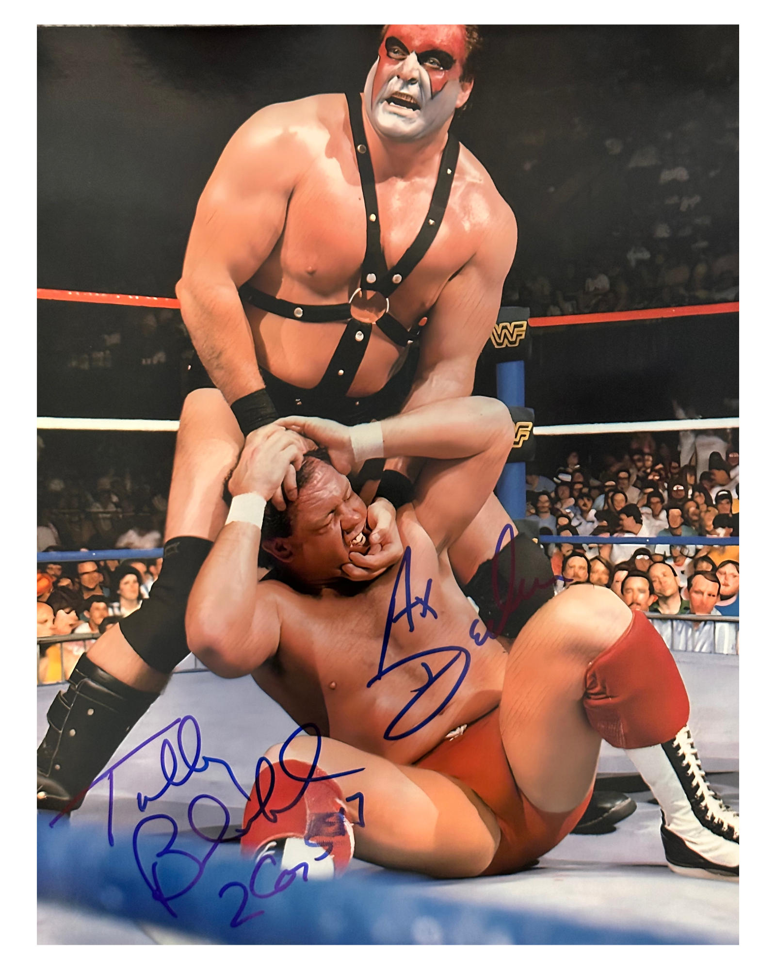 Witness the epic clash of two wrestling titans with this unforgettable 8x10 photo featuring Tully Blanchard and Ax of Demolition. This high-energy image captures the intensity and raw power of these legendary competitors.